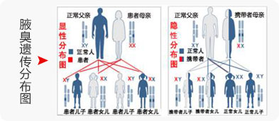 "男传传一个,女传传一窝",腋臭从遗传角度而言,属于显性基因遗传,而且遗传几率非常高,目前绝大部分的狐臭患者都是由于遗传因素而患上狐臭的。